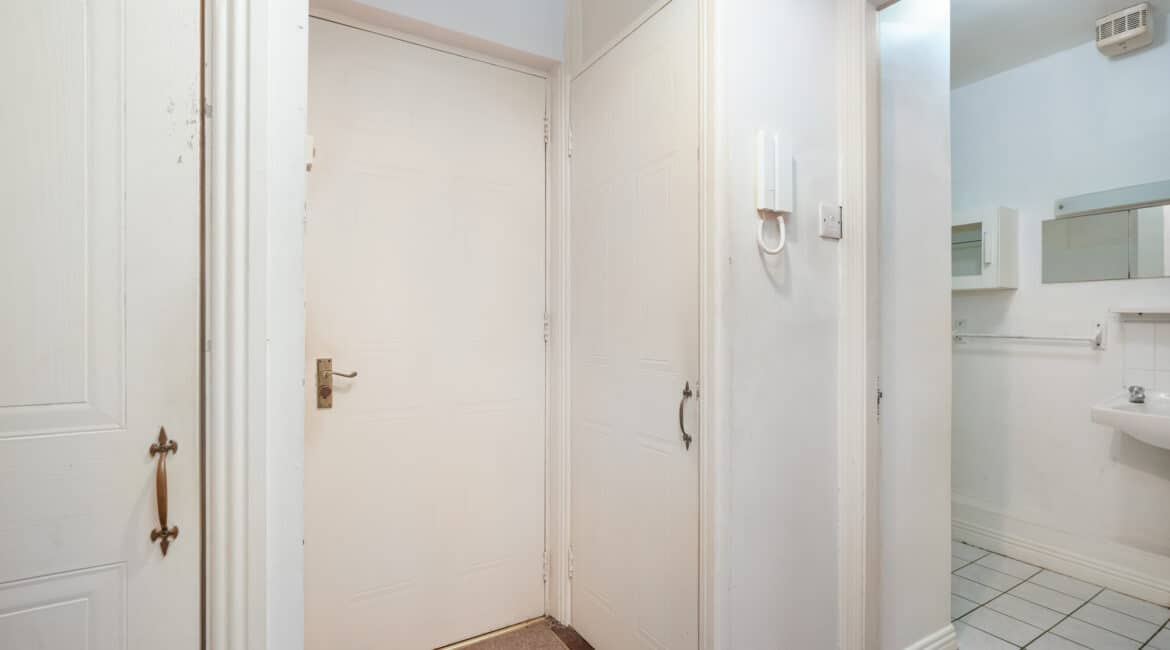 The accommodation comprises a welcoming entrance hallway with storage room, a spacious open-plan living and dining area, a well-appointed kitchen space, a large double bedroom with built-in wardrobes, and a modern family bathroom. The apartment further benefits from double glazing throughout, electric heating, and an intercom system for added security and convenience.